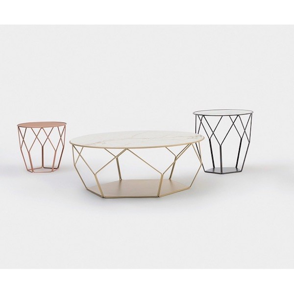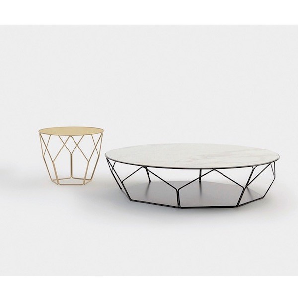 Il tavolino è realizzato con struttura in tondini di acciaio curvati e verniciati, il top può essere prodotto in cristallo o ceramica lucida od opaca.