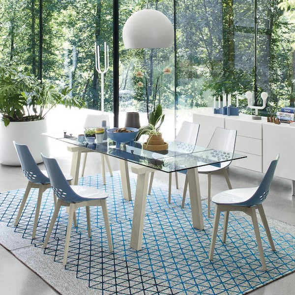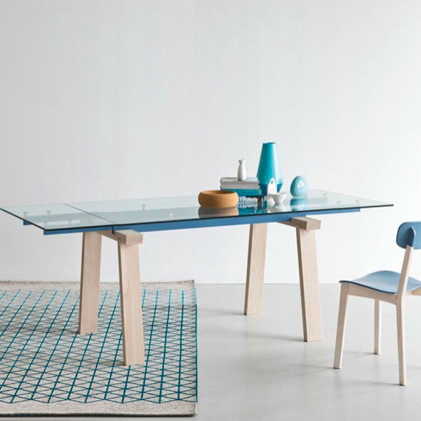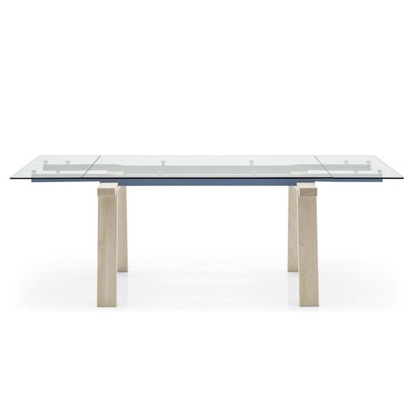 Le quattro gambe sono realizzate in legno massello di faggio mentre le guide traversali, che svolgono anche il tuo,o di struttura, sono in acciaio verniciato. Il piano principale, invece, in coordinato con le allunghe sono in vetro temperato.