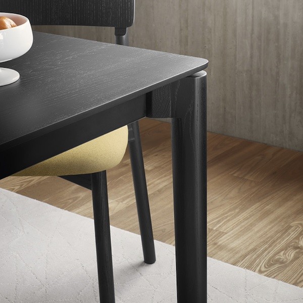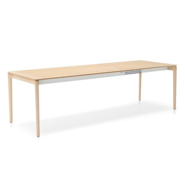 Le quattro gambe, dalle linee sinuose e slancianti, sono realizzate internate in legno massello di frassino. Queste si incastrano, senza una soluzione di continuità, al piano principale che insieme alla prolunga sono realizzate in legno impiallacciato di frassino che garantiscono massima qualità ed eleganza al prodotto.