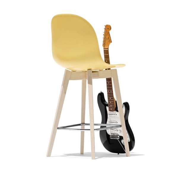 L'intero fusto, in base alla tinta selezionata, è realizzato in legno massello di faggio oppure di frassino. Le 4 gambe sono tenute unite da un poggiapiedi in metallo cromato lucido. La scocca, invece è prodotta in polipropilene, un materiale di derivazione plastica con carica minerale stampato in co-iniezione.