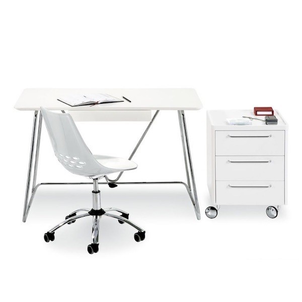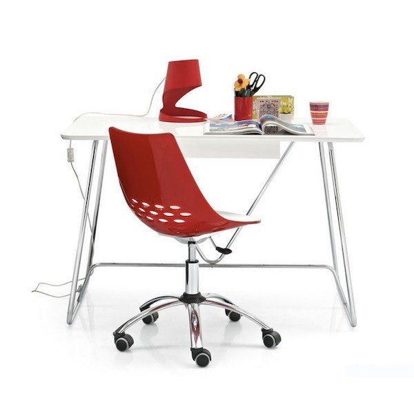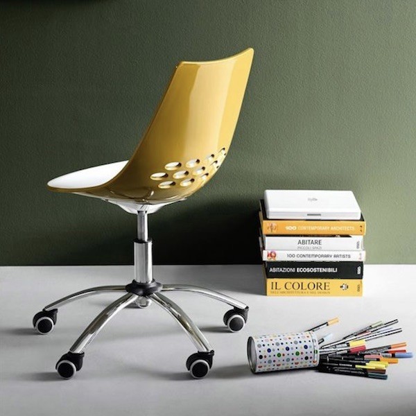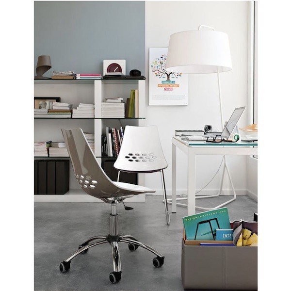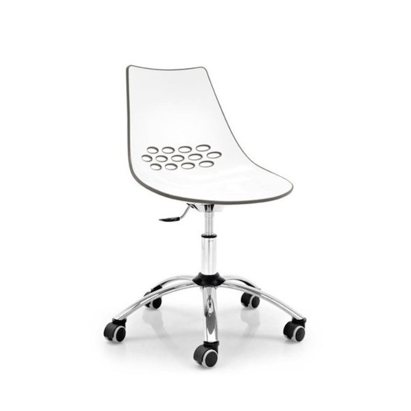 Jam è una sedia girevole a 360 gradi e regolabile in altezza tramite un pistone a gas azionabile con una leva riposta al di sotto della seduta. Funziona sono le 5 ruote in gomma siliconata morbida antigraffio.