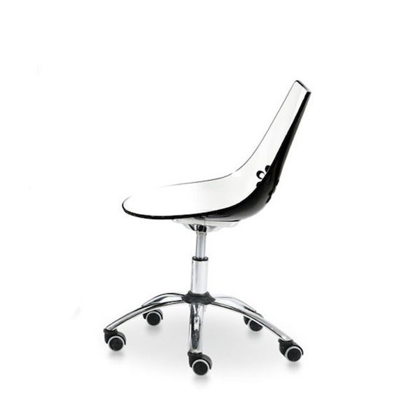 Particolare è la monoscoccoa realizzata in policarbonato, un materiale plastico innovativo molto resistente che fornisce un effetto simile al vetro. Il sedile è sostenuto da una struttura interamente in metallo verniciato cromato lucido a specchio.
