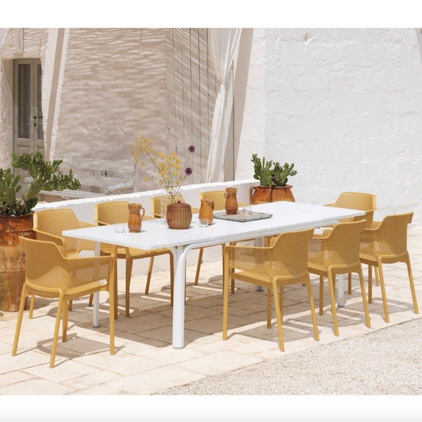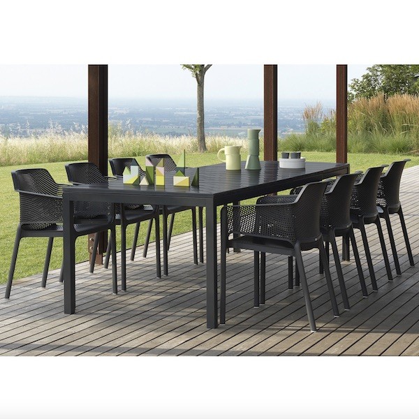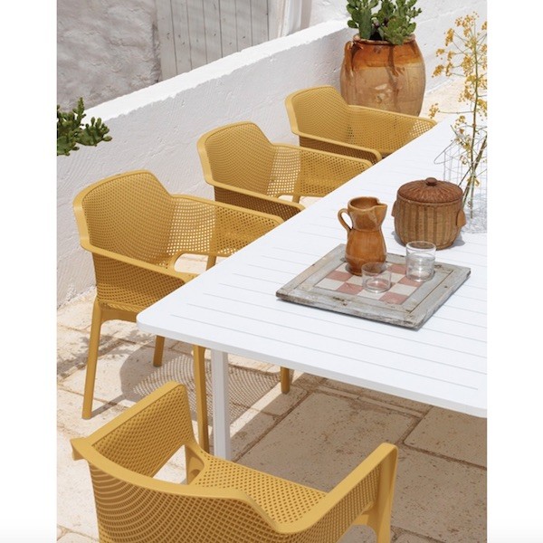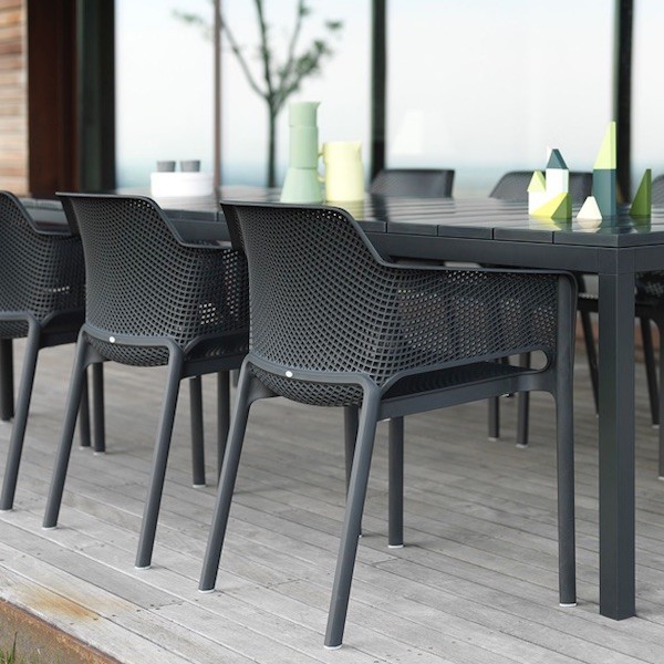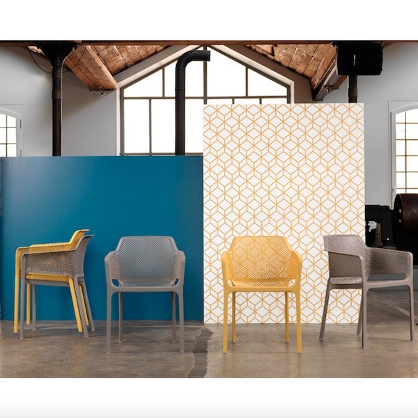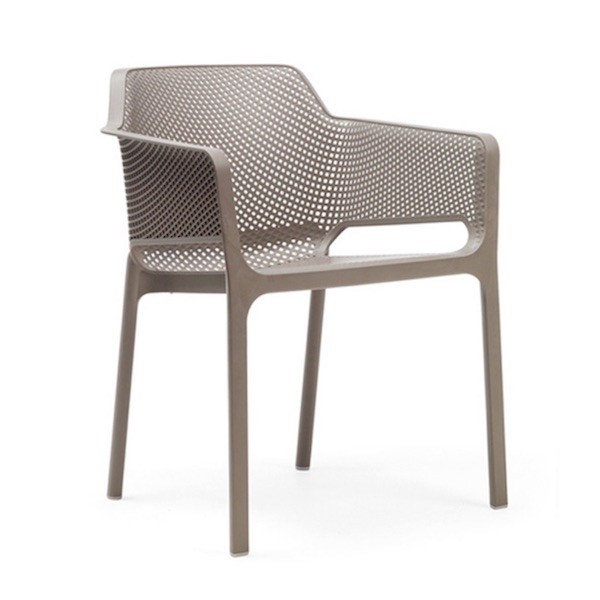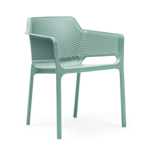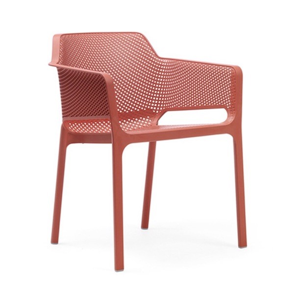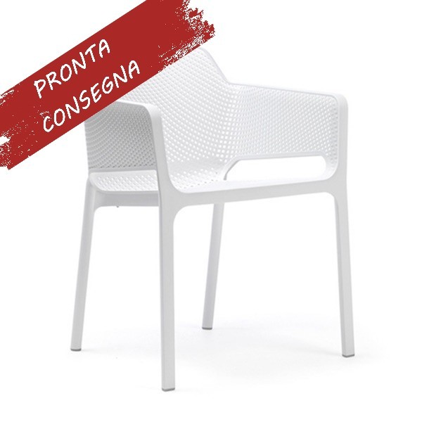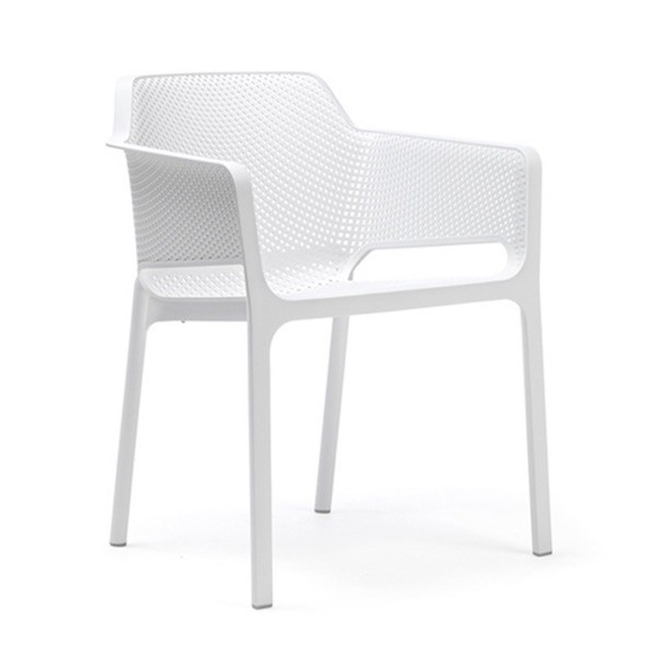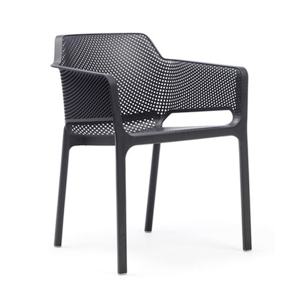 Net con braccioli è la poltroncina monoblocco della collezione Nardi dal design moderno, é prodotta con materiale di ultima generazione riciclabile al 100%.