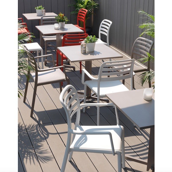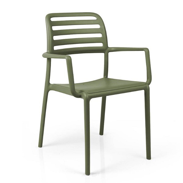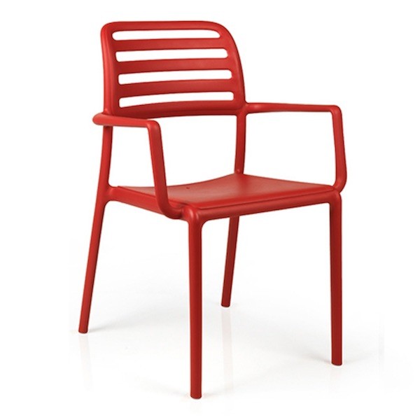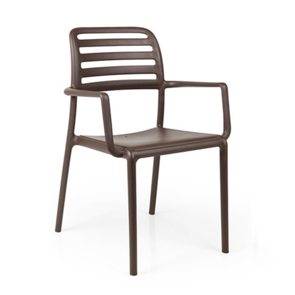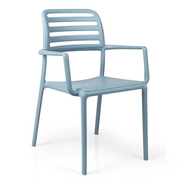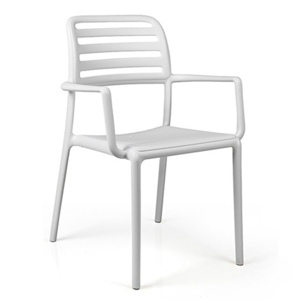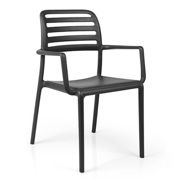 Costa con braccioli è la poltroncina prodotta da Nardi, dal design moderno ed essenziale, é prodotta con polimero termoplastico di ultima generazione riciclabile al 100%.
