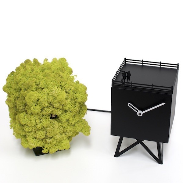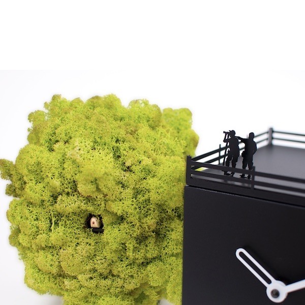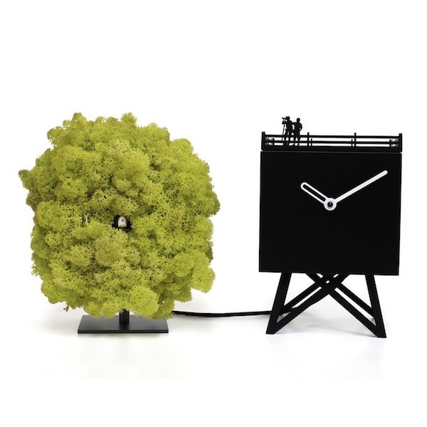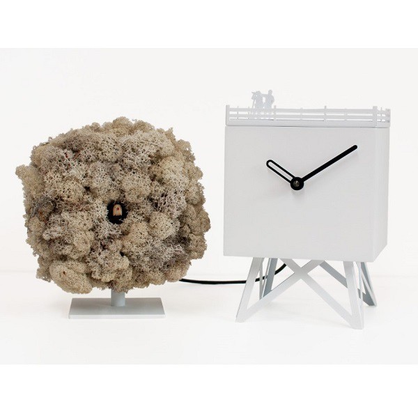 L'oggetto è composto da una casetta in legno verniciato nero dove sul tetto trovano collocazione due fotografi pronti ad immortalare l'uccellino, o meglio il cucù, che fuoriesce dalla sua più naturale dimora. Inoltre, nella parte frontale della casetta, trovano alloggio le lancette segna orario di colore bianco. L'albero invece è rivestito in Moss, un lichene naturale che si conserva benissimo anche in assenza di luce naturale.