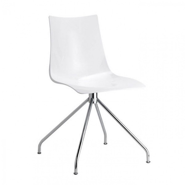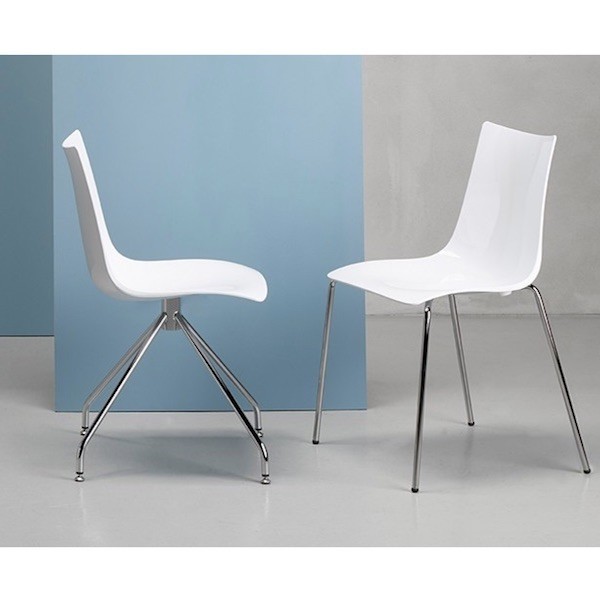 La sedia è disponibile nell'unica variante colore con trespolo Cromato ad effetto specchio e la seduta in Bianco Pieno dall'effetto lucido.