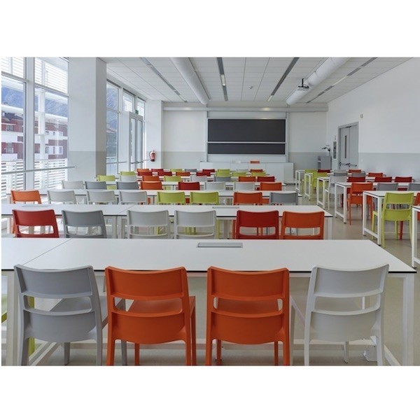 La sedia inoltre è facile da riporre, quando non utilizzata, grazie alla sua capacità d'impilarsi una dentro l'altra fino ad un massimo di 10 pezzi se poggiate a terra, oppure fino a 16 se messe nell'apposito carrello trasportatore acquistabile come accessorio.