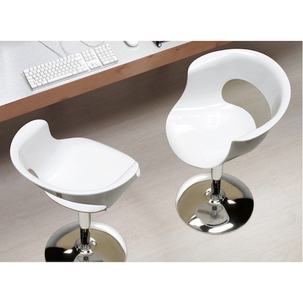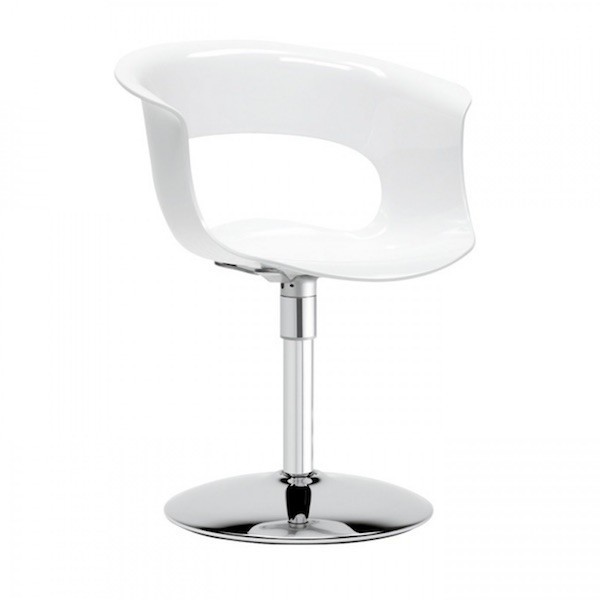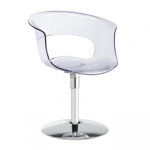 La poltroncina viene realizzata con la base e la colonna centrale in metallo cromato, la seduta in policarbonato riciclabile in tpolicarbonato MAKROLON, leggero e resistente fornito dalla Bayer.