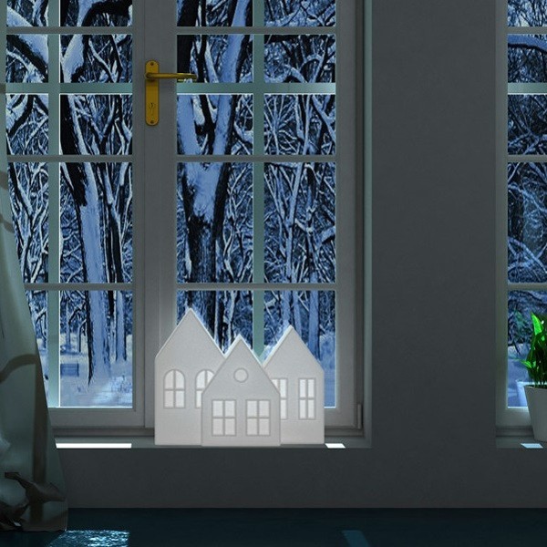 Kolme è la lampada da tavolo dalla forma di un paesaggio scandinavo- La silhouette delle case illuminate, crea un'atmosfera natalizia ma al tempo stesso contemporanea. Ideale per creare atmosfere invernali uniche negli ambienti in cui viene collocata.